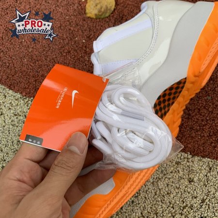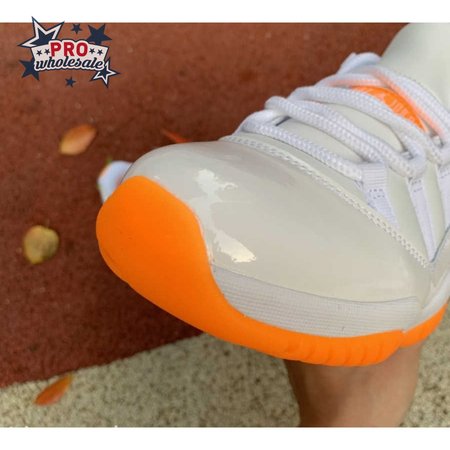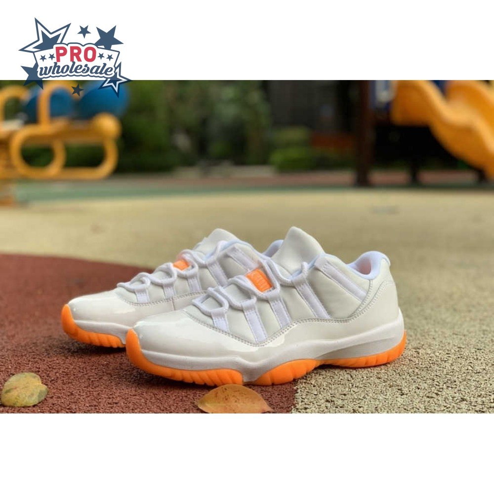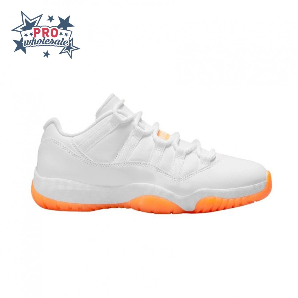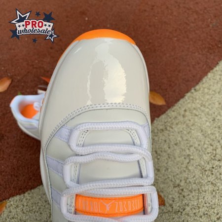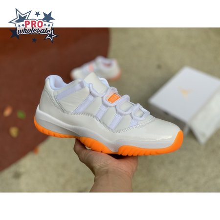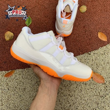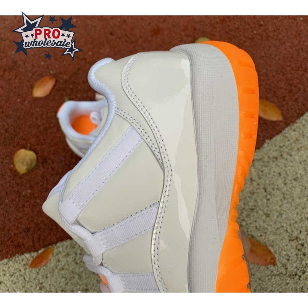 The women"s Air Jordan 11 Retro Low "Bright Citrus" revives a simplistic two-tone colorway initially released in 2001 and previously reissued in 2015 as a kids" exclusive. The low-top utilizes a white leather upper with webbing lace loops and a shiny patent leather overlay in a matching white finish. Vibrant orange accents stand out on the sneaker"s branding elements, including an embroidered Jumpman on the heel tab. Lightweight cushioning is provided by a Phylon midsole, reinforced underfoot by a carbon fiber spring plate and a translucent orange rubber outsole.