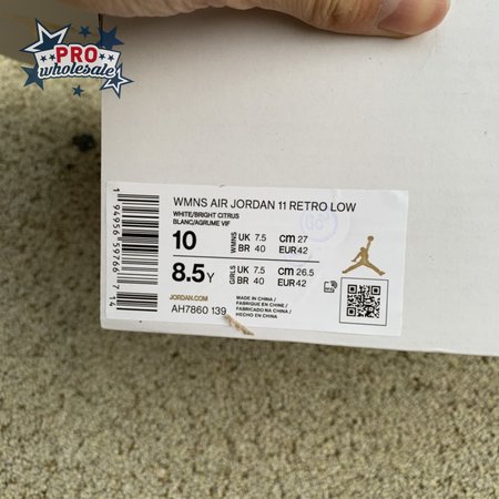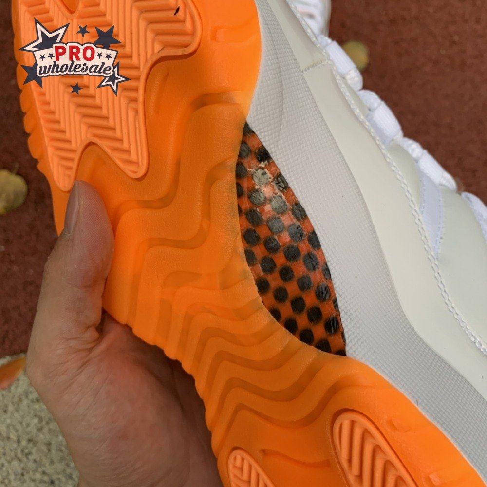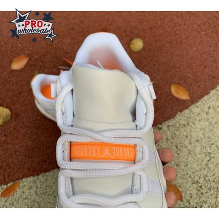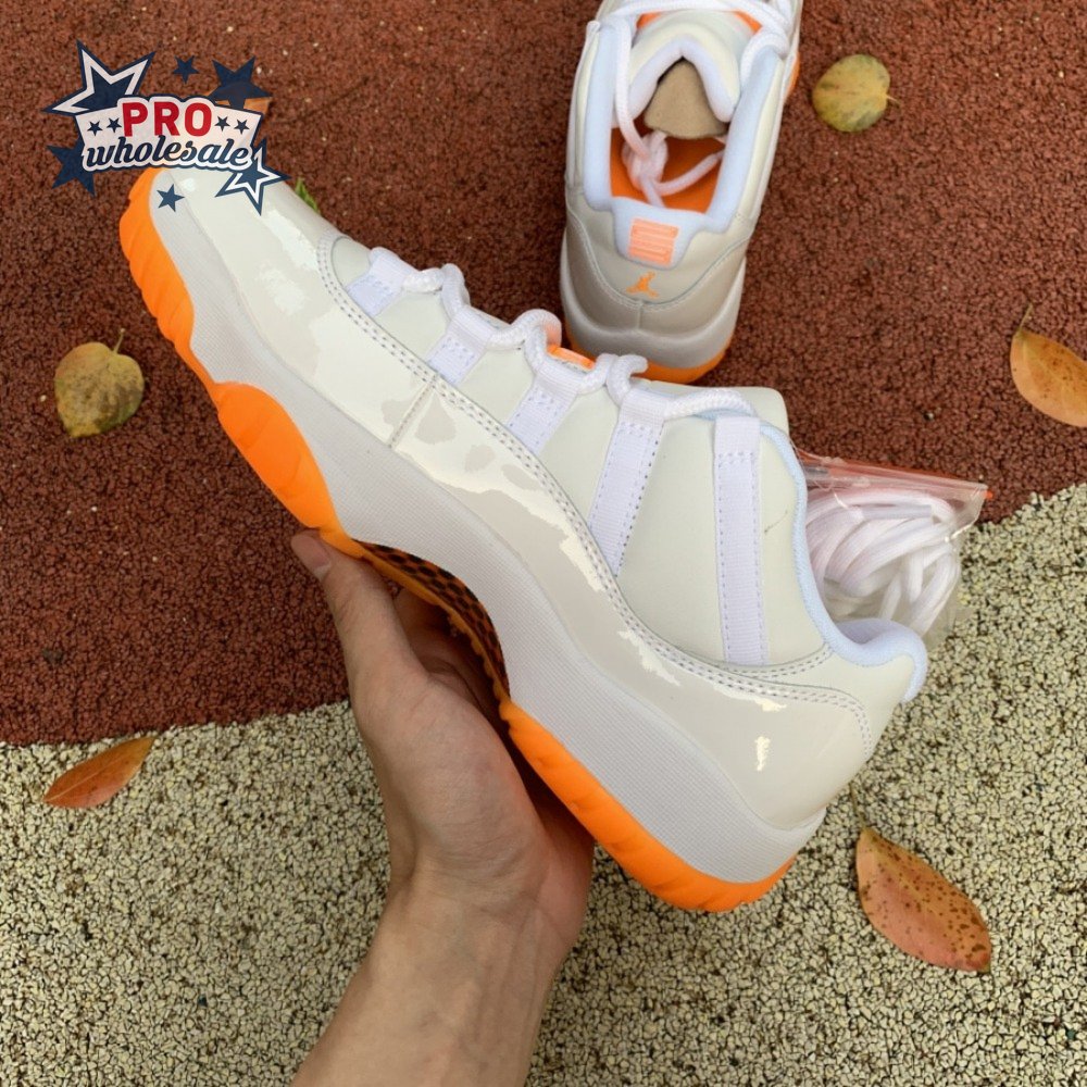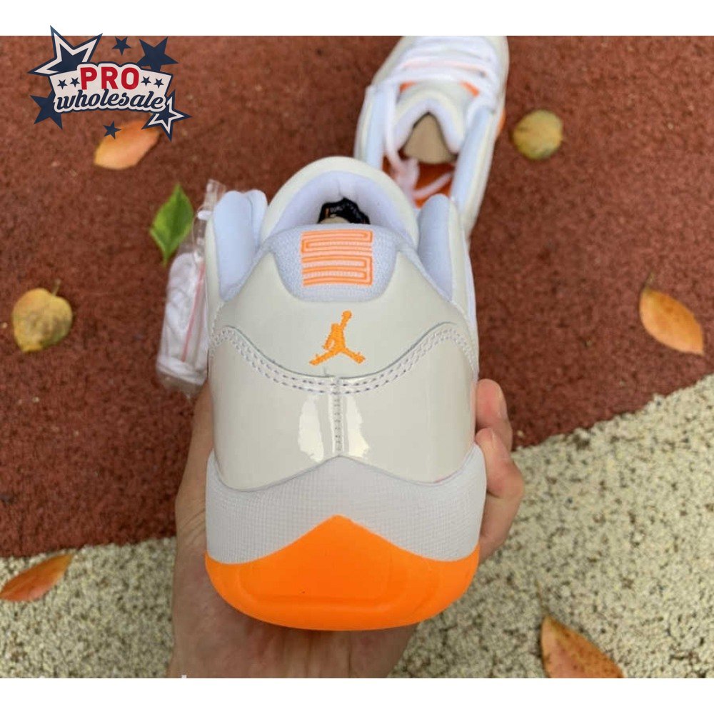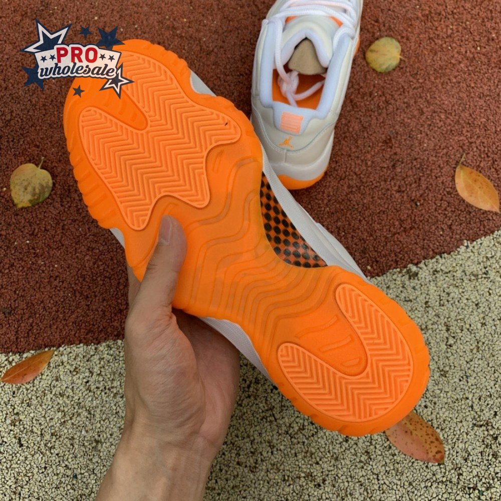 The women"s Air Jordan 11 Retro Low "Bright Citrus" revives a simplistic two-tone colorway initially released in 2001 and previously reissued in 2015 as a kids" exclusive. The low-top utilizes a white leather upper with webbing lace loops and a shiny patent leather overlay in a matching white finish. Vibrant orange accents stand out on the sneaker"s branding elements, including an embroidered Jumpman on the heel tab. Lightweight cushioning is provided by a Phylon midsole, reinforced underfoot by a carbon fiber spring plate and a translucent orange rubber outsole.