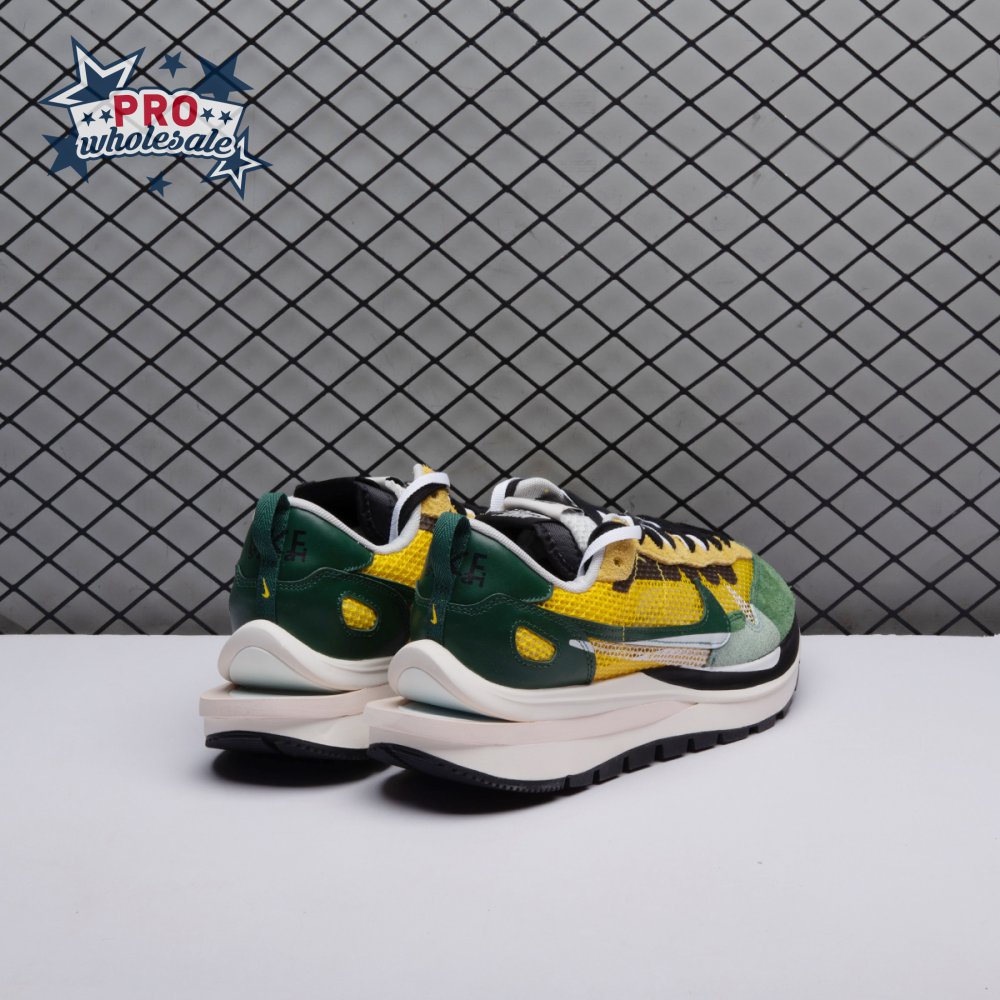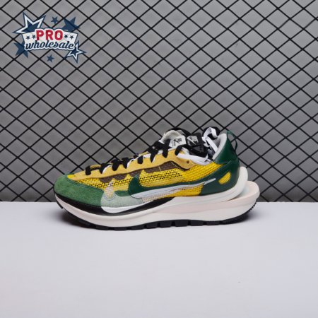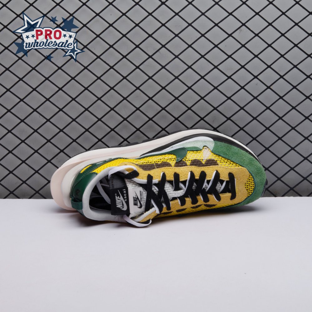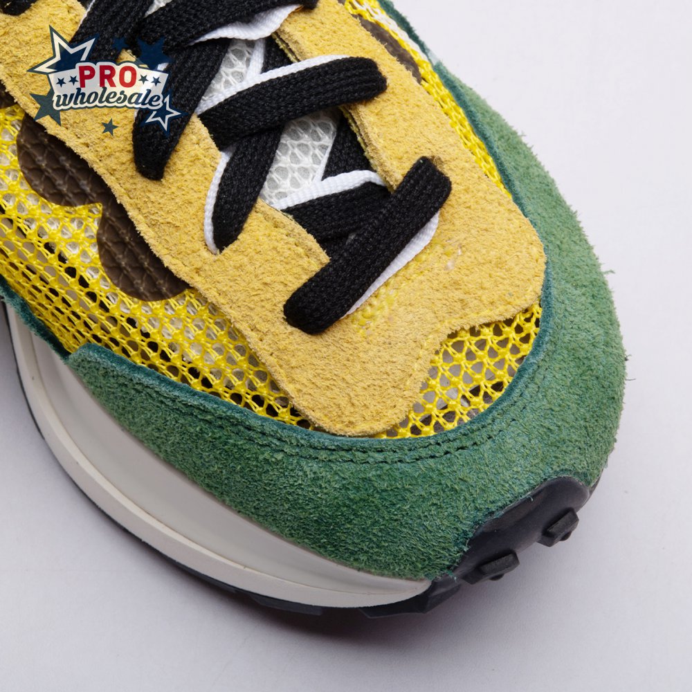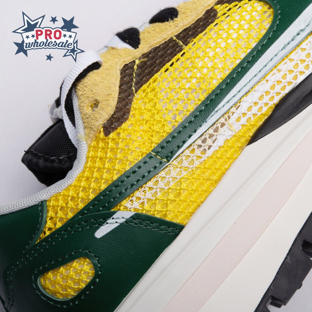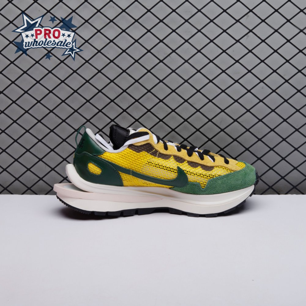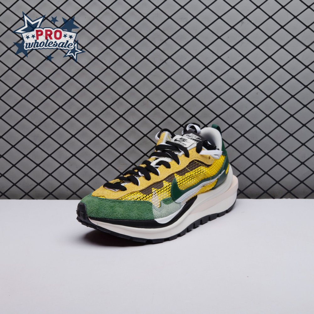 Made in partnership with the progressive Japanese fashion label, the Sacai x Nike VaporWaffle "Tour Yellow" picks up from where the brands" 2019 LDV Waffle collaboration left off. Like its predecessor, this pair doubles up on the tongue, laces and Swoosh branding. A breathable yellow mesh build, fortified with teal overlays in leather and suede, rides on a stacked midsole with split construction at the heel. Nike"s signature waffle outsole delivers grippy traction.