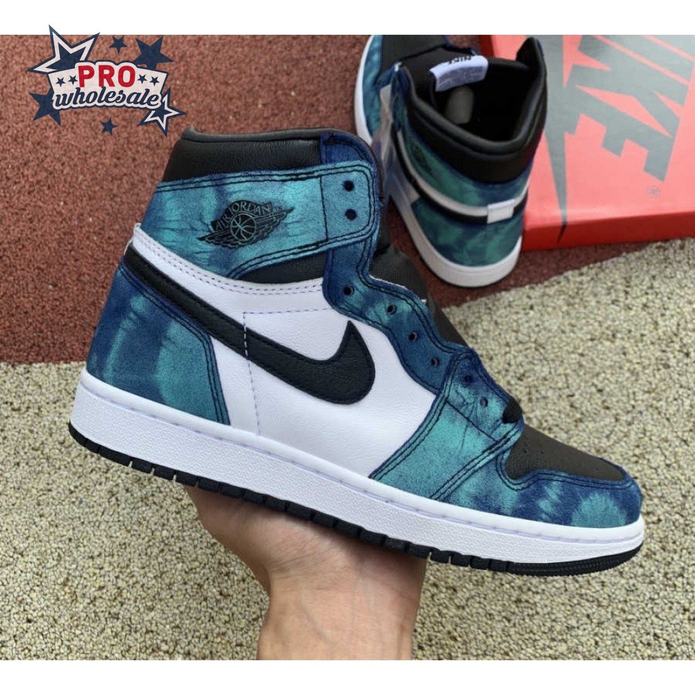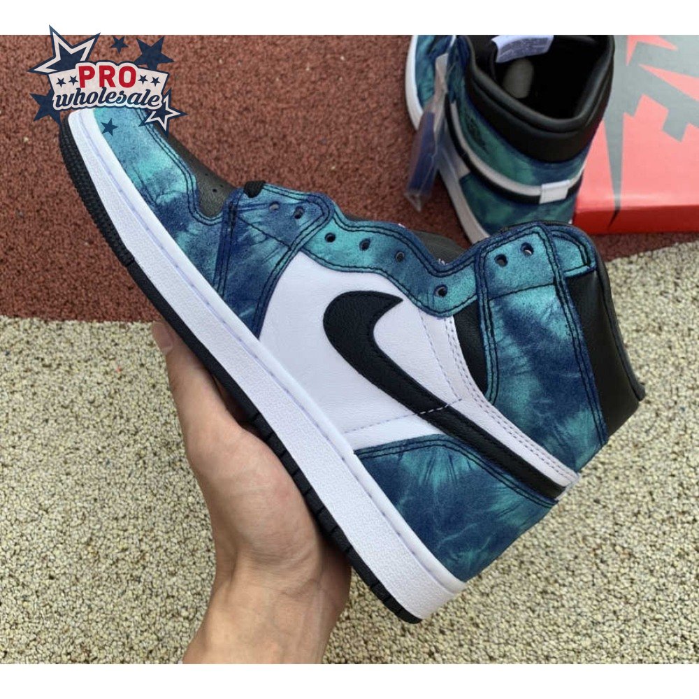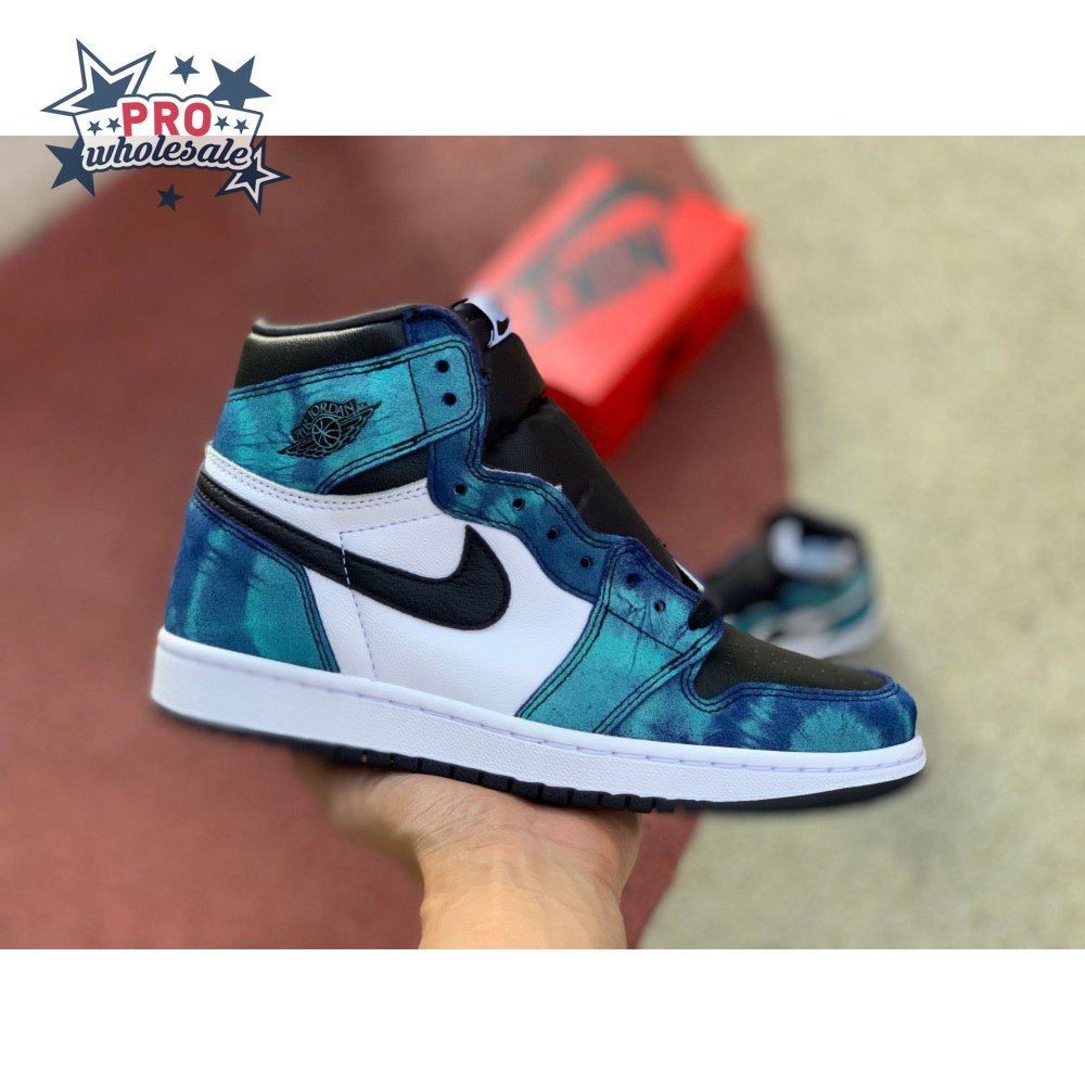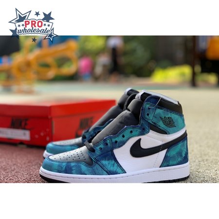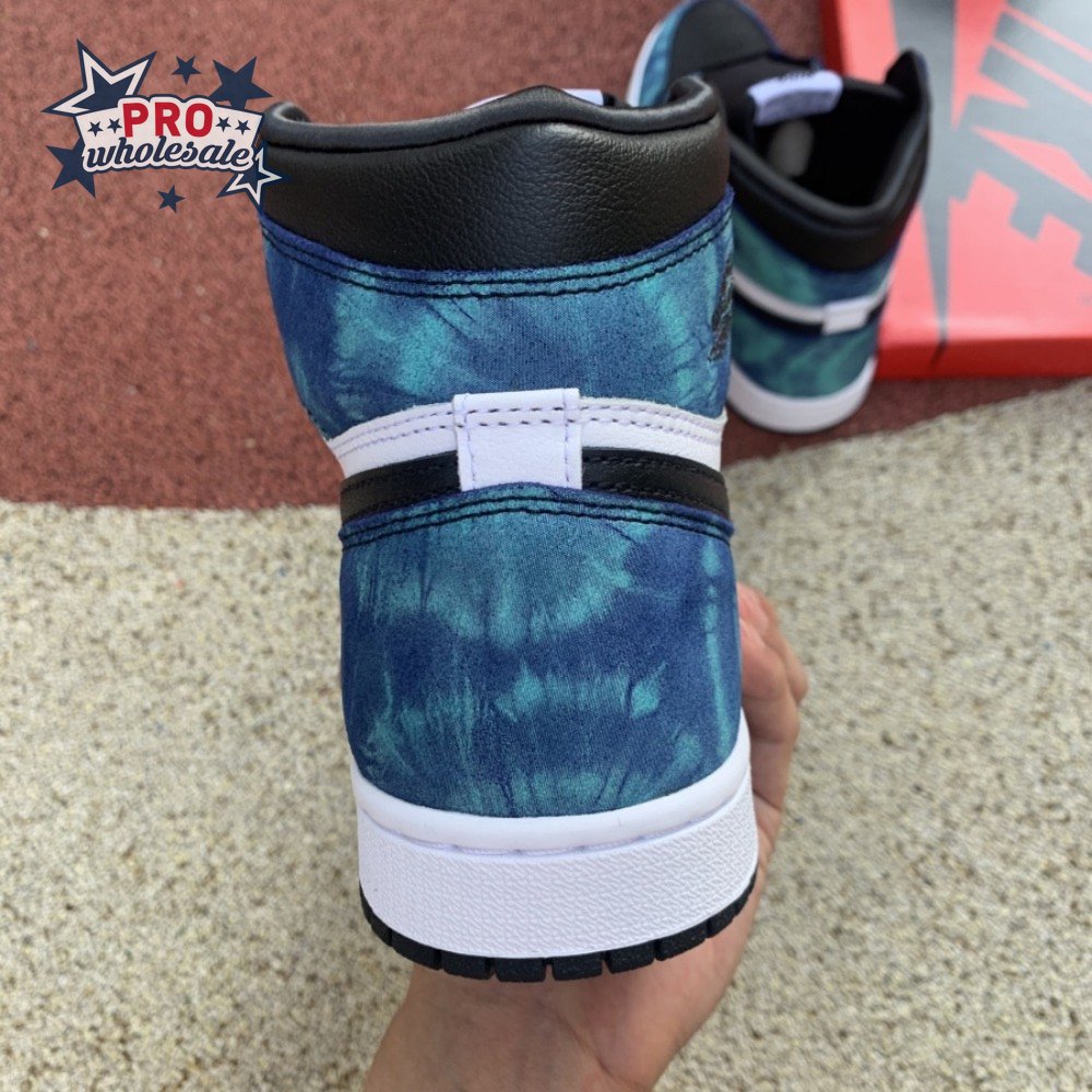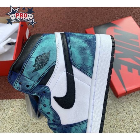 The women"s Air Jordan 1 Retro High OG "Tie-Dye" gives the iconic silhouette a fashion-forward look, highlighted by a faux hand-dyed effect on the sneaker"s heel and forefoot overlays. The swirling blue and teal hues are offset by a white leather quarter panel and contrasting black leather on the collar and toe box. Branding elements include a black Swoosh, matching black Wings logo and a Nike tag atop the lightly padded nylon tongue.