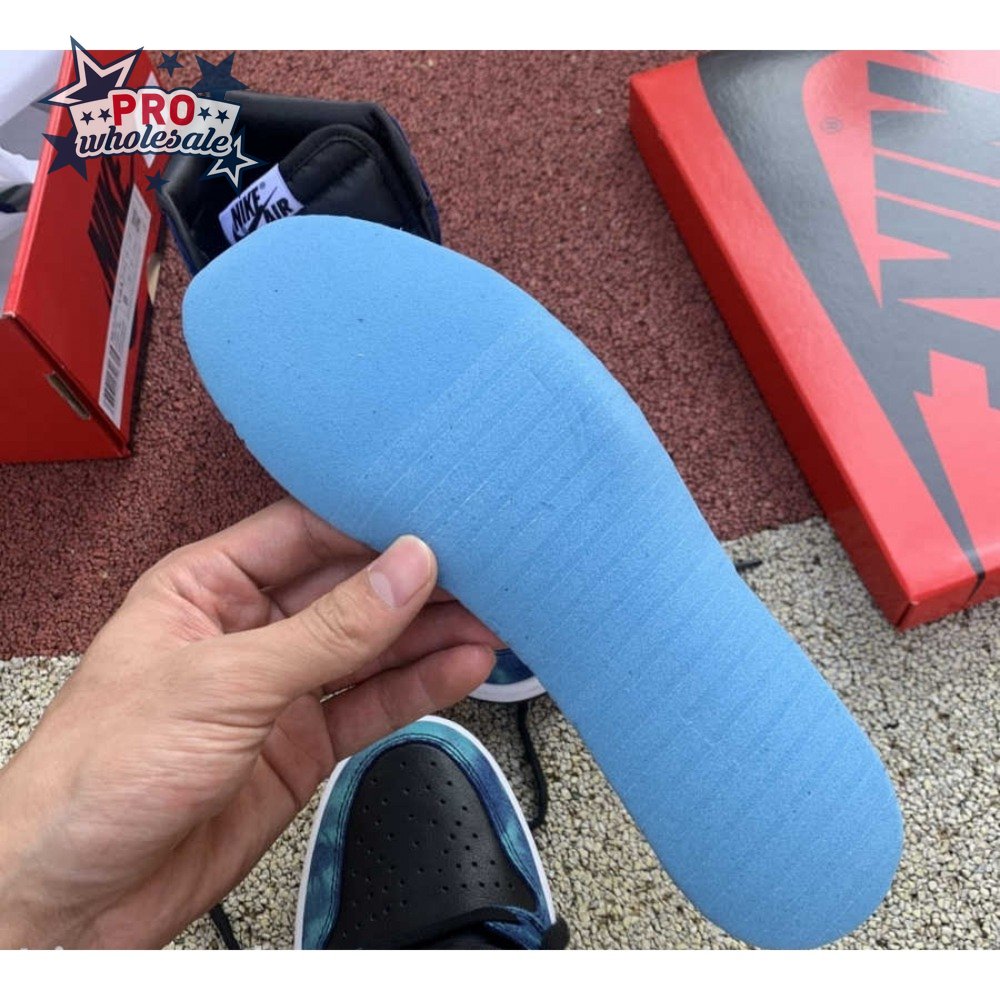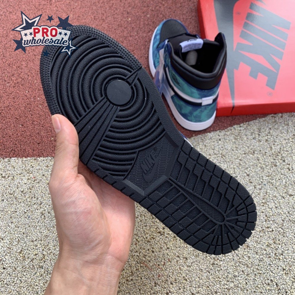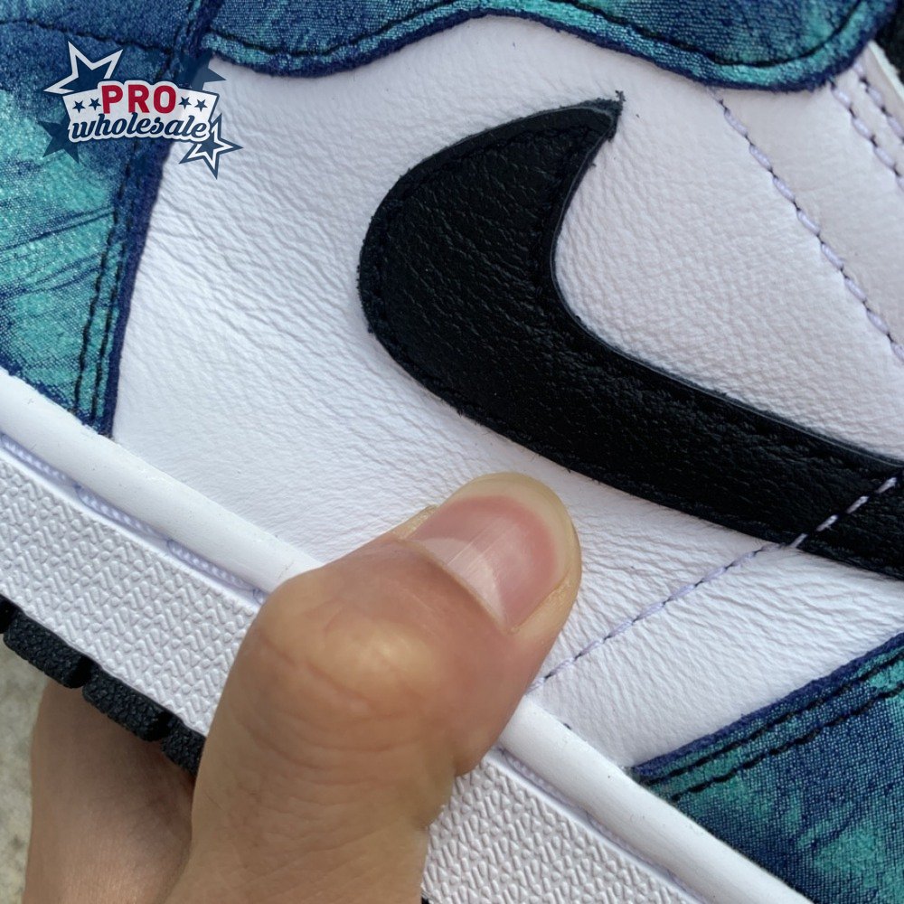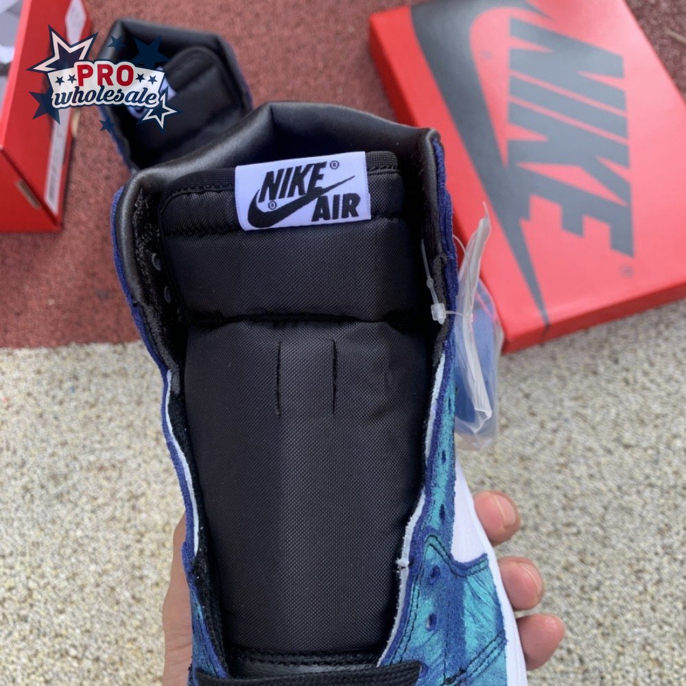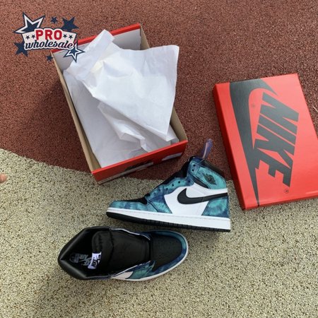 The women"s Air Jordan 1 Retro High OG "Tie-Dye" gives the iconic silhouette a fashion-forward look, highlighted by a faux hand-dyed effect on the sneaker"s heel and forefoot overlays. The swirling blue and teal hues are offset by a white leather quarter panel and contrasting black leather on the collar and toe box. Branding elements include a black Swoosh, matching black Wings logo and a Nike tag atop the lightly padded nylon tongue.