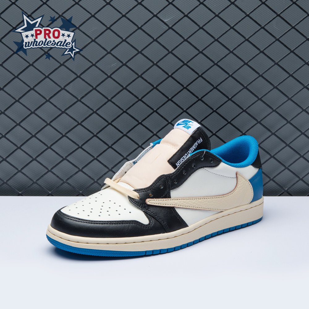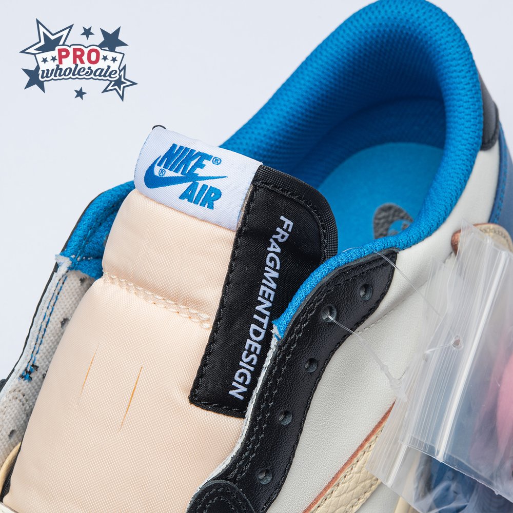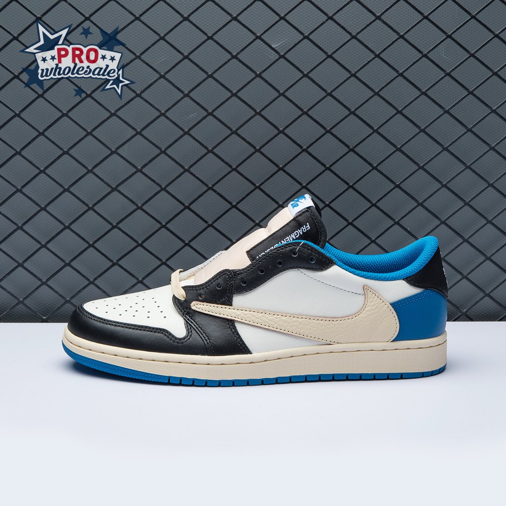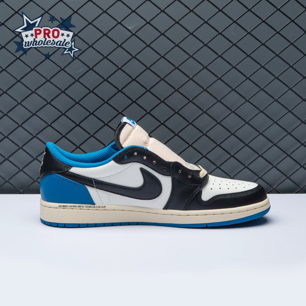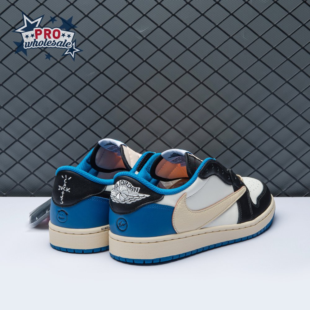 The Fragment Design x Travis Scott x Air Jordan 1 Retro Low delivers a collaboration that blends signature details associated with both La Flame and Hiroshi Fujiwara"s influential imprint. The color palette is reminiscent of past Fragment joint ventures, highlighted by a white leather upper with contrasting overlays in black and royal blue. Scott"s inverted and oversized Swoosh decorates the lateral side panel in an off-white finish, while a standard black Swoosh is stitched onto the opposite side. Cactus Jack branding adorns the heel tab of the left shoe, along with the rapper"s smiley face logo stamped directly underneath. On the heel of the right shoe, a classic Jordan Wings logo is joined by Fragment"s lightning bolt trademark.