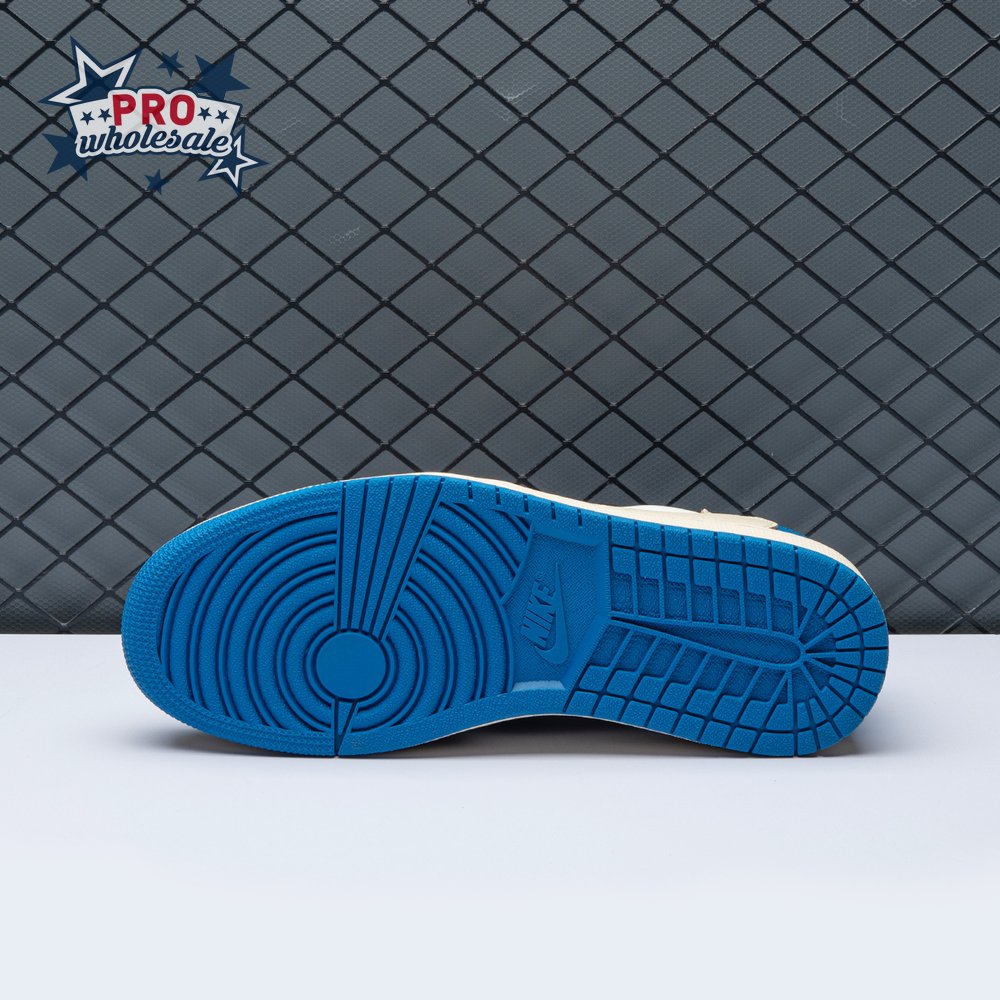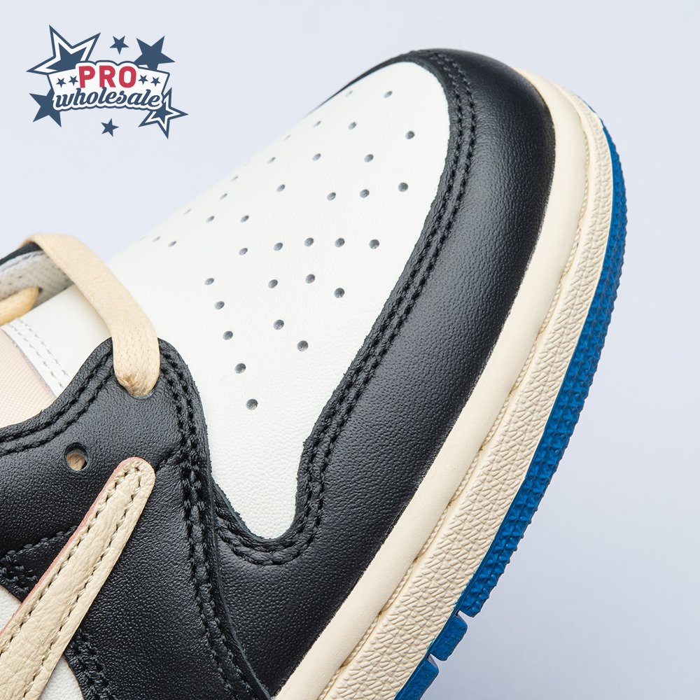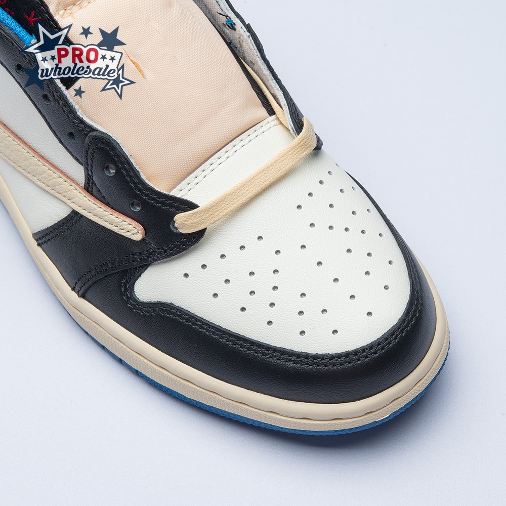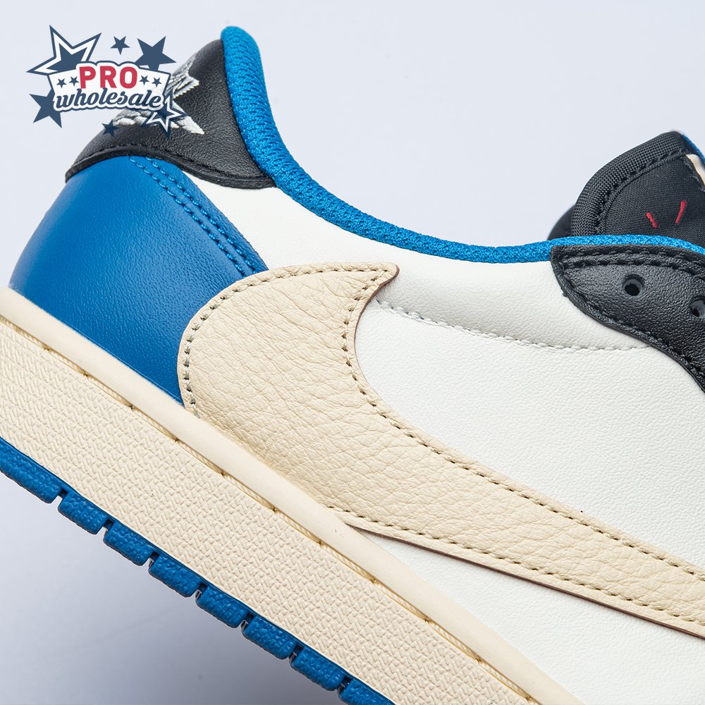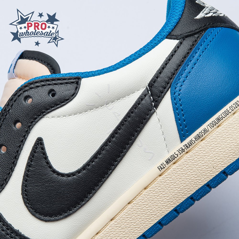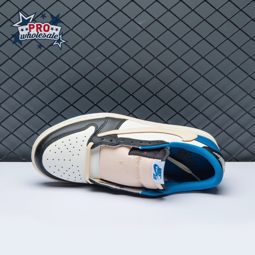 The Fragment Design x Travis Scott x Air Jordan 1 Retro Low delivers a collaboration that blends signature details associated with both La Flame and Hiroshi Fujiwara"s influential imprint. The color palette is reminiscent of past Fragment joint ventures, highlighted by a white leather upper with contrasting overlays in black and royal blue. Scott"s inverted and oversized Swoosh decorates the lateral side panel in an off-white finish, while a standard black Swoosh is stitched onto the opposite side. Cactus Jack branding adorns the heel tab of the left shoe, along with the rapper"s smiley face logo stamped directly underneath. On the heel of the right shoe, a classic Jordan Wings logo is joined by Fragment"s lightning bolt trademark.