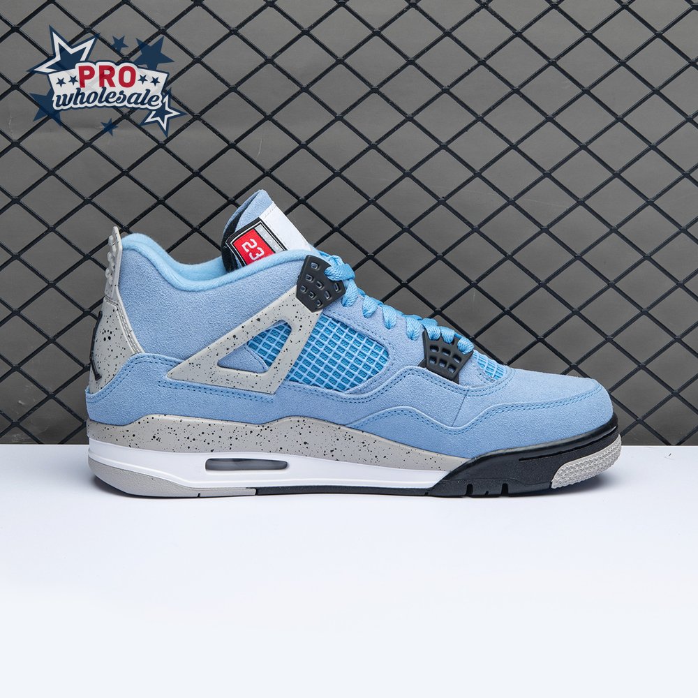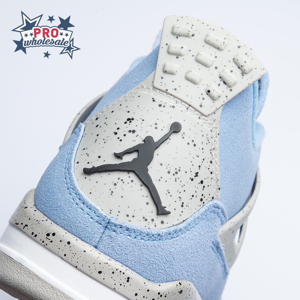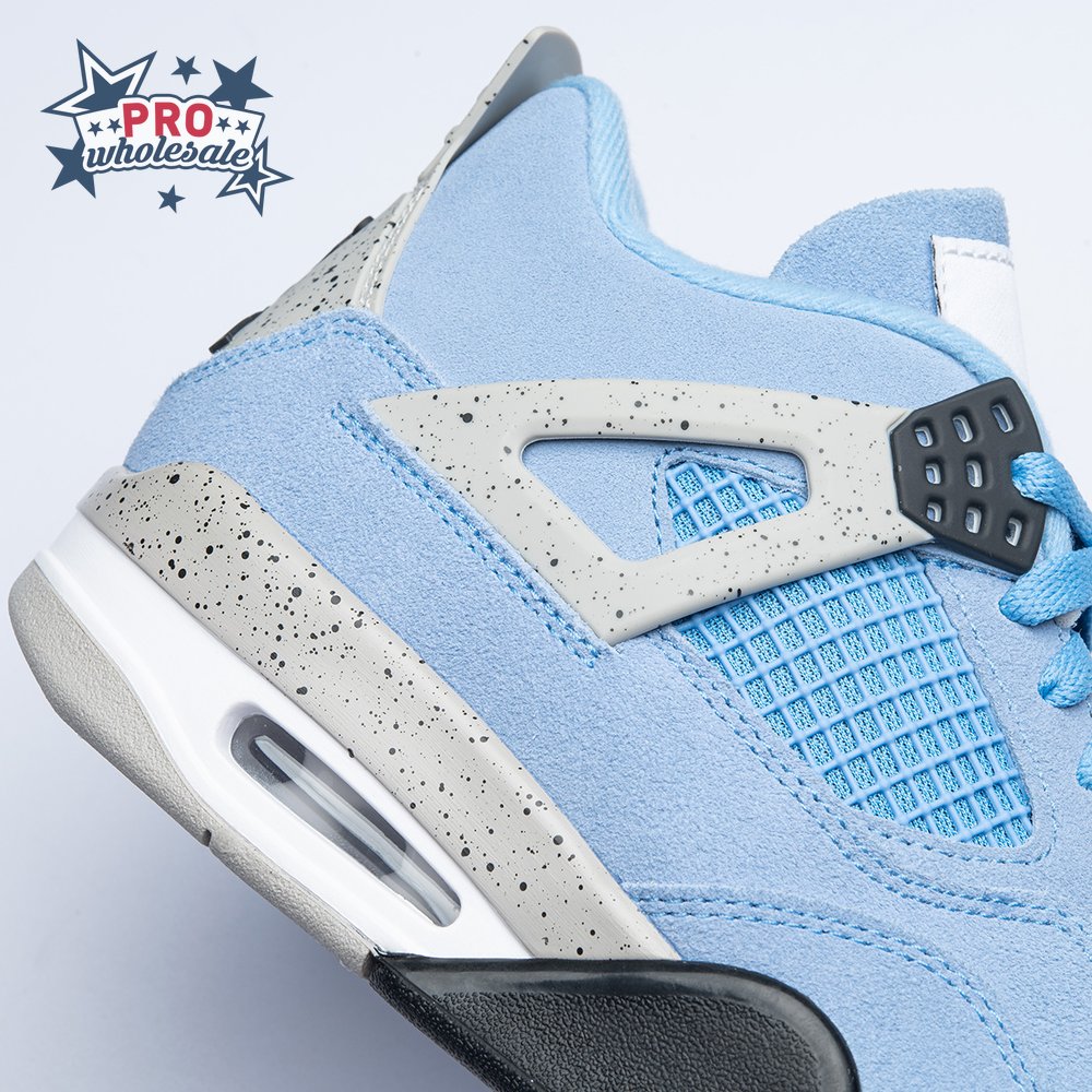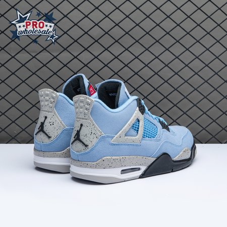 The Air Jordan 4 Retro "University Blue" updates the classic silhouette with a suede upper in a familiar hue inspired by Michael Jordan"s UNC alma mater. The bright blue palette is contrasted by a speckled grey finish on the sneaker"s supportive wings and back heel, featuring a raised Jumpman icon in black. Secondary Jumpman branding adorns the woven tongue tag, designed to mimic a jock tag that typically appears on the bottom hem of Jordan jerseys.