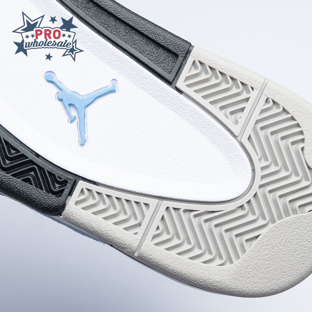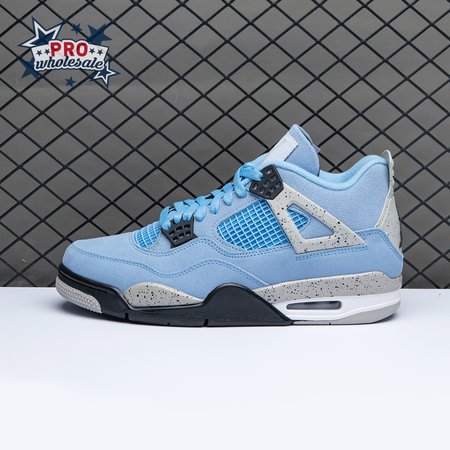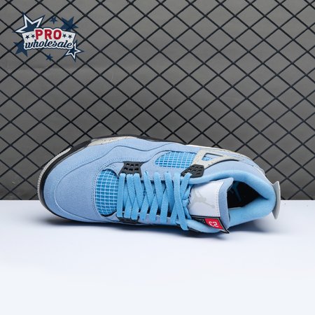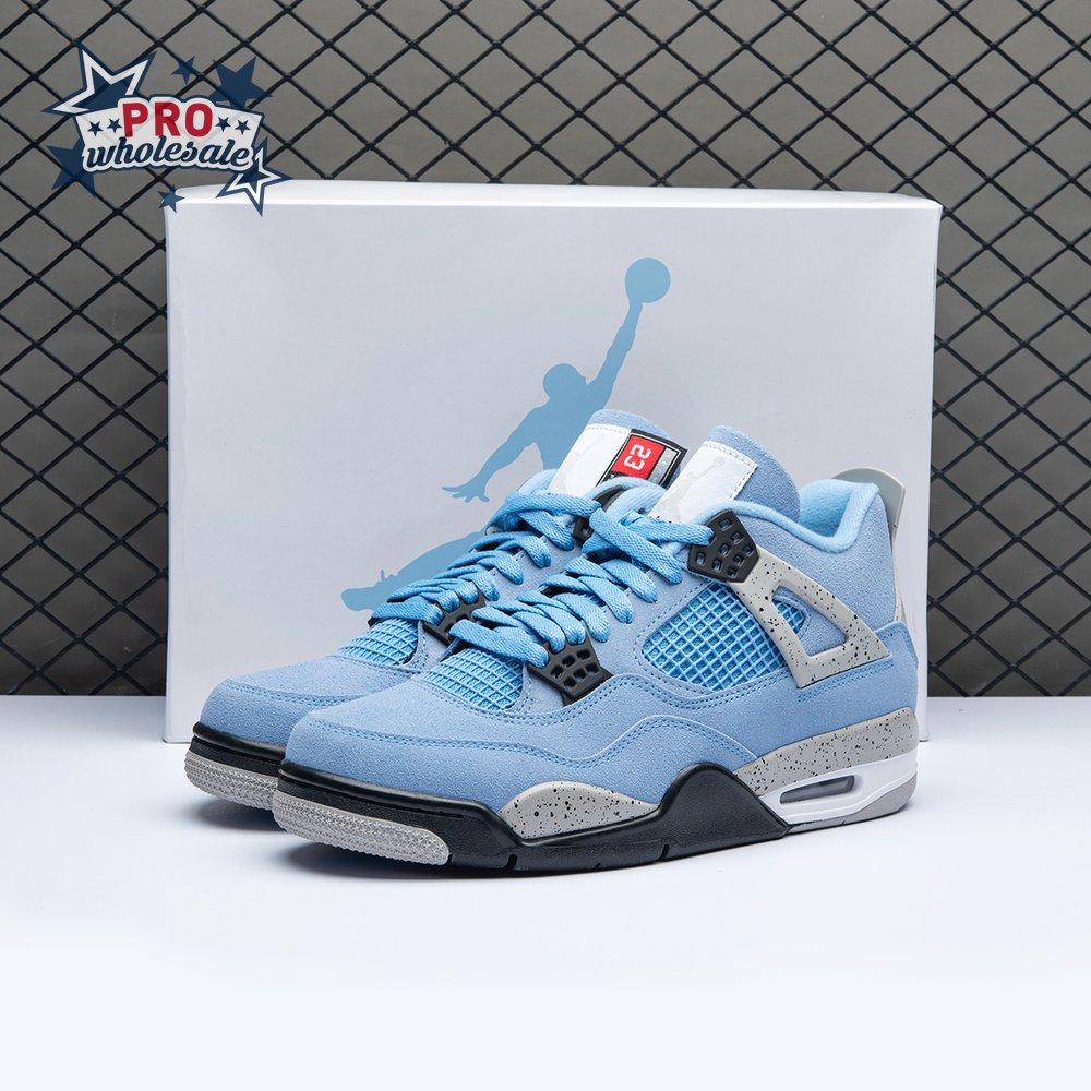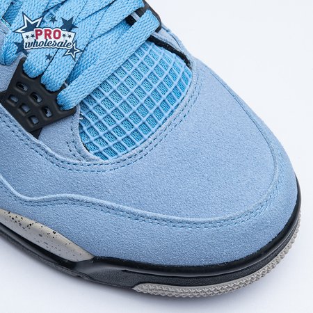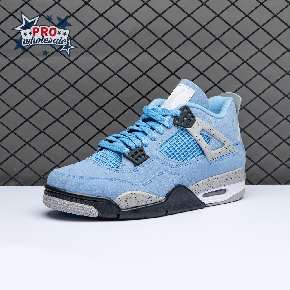 The Air Jordan 4 Retro "University Blue" updates the classic silhouette with a suede upper in a familiar hue inspired by Michael Jordan"s UNC alma mater. The bright blue palette is contrasted by a speckled grey finish on the sneaker"s supportive wings and back heel, featuring a raised Jumpman icon in black. Secondary Jumpman branding adorns the woven tongue tag, designed to mimic a jock tag that typically appears on the bottom hem of Jordan jerseys.