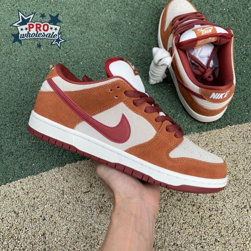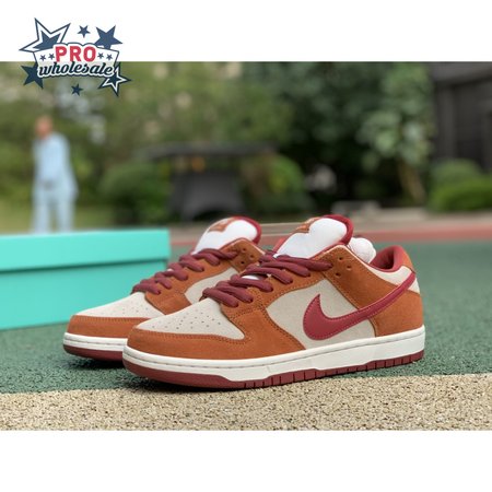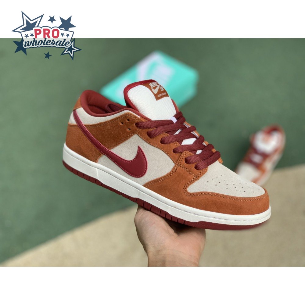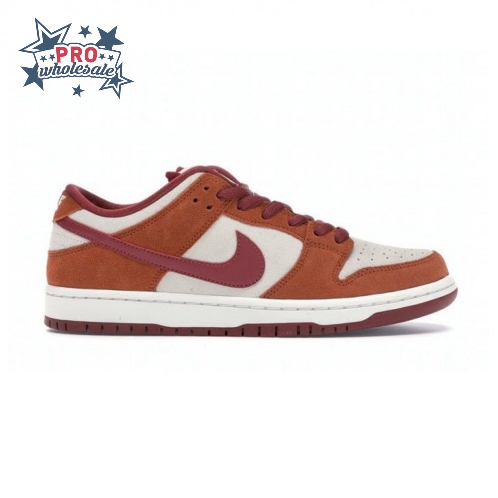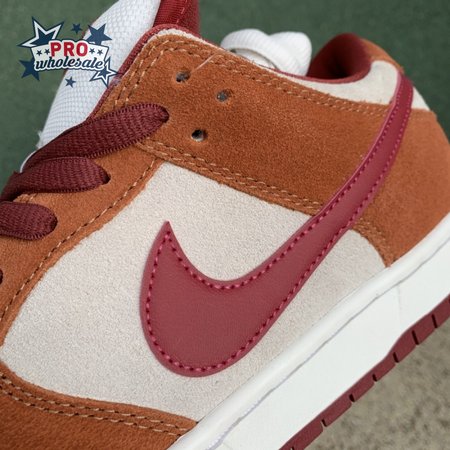 In July 2019, the popular low-cut silhouette from Nike Skateboarding was released in a fresh colorway. The Nike Dunk Low Pro SB 'Dark Russet" features a Summit White suede upper with Dark Russet and Cedar on the suede overlays as well as on the smooth leather Swoosh, laces and insole. A padded collar and Zoom Air unit in the sockliner provide comfort. Beneath, the midsole sits atop a rubber outsole with a circular tread for dynamic grip.