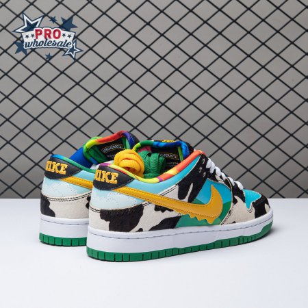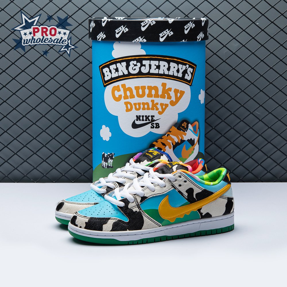 Made in collaboration with Ben & Jerry"s, the Nike Dunk Low SB "Chunky Dunky" replicates the packaging used for the ice cream brand"s Chunky Monkey flavor. The leather upper depicts blue skies and green pastures, while pony-hair overlays are rendered in a spotted cow print. A yellow leather Swoosh is treated to a melting ice cream effect for added visual flair. Atop the tongue, the woven tag features a Chunky Dunky callout alongside Nike SB branding.