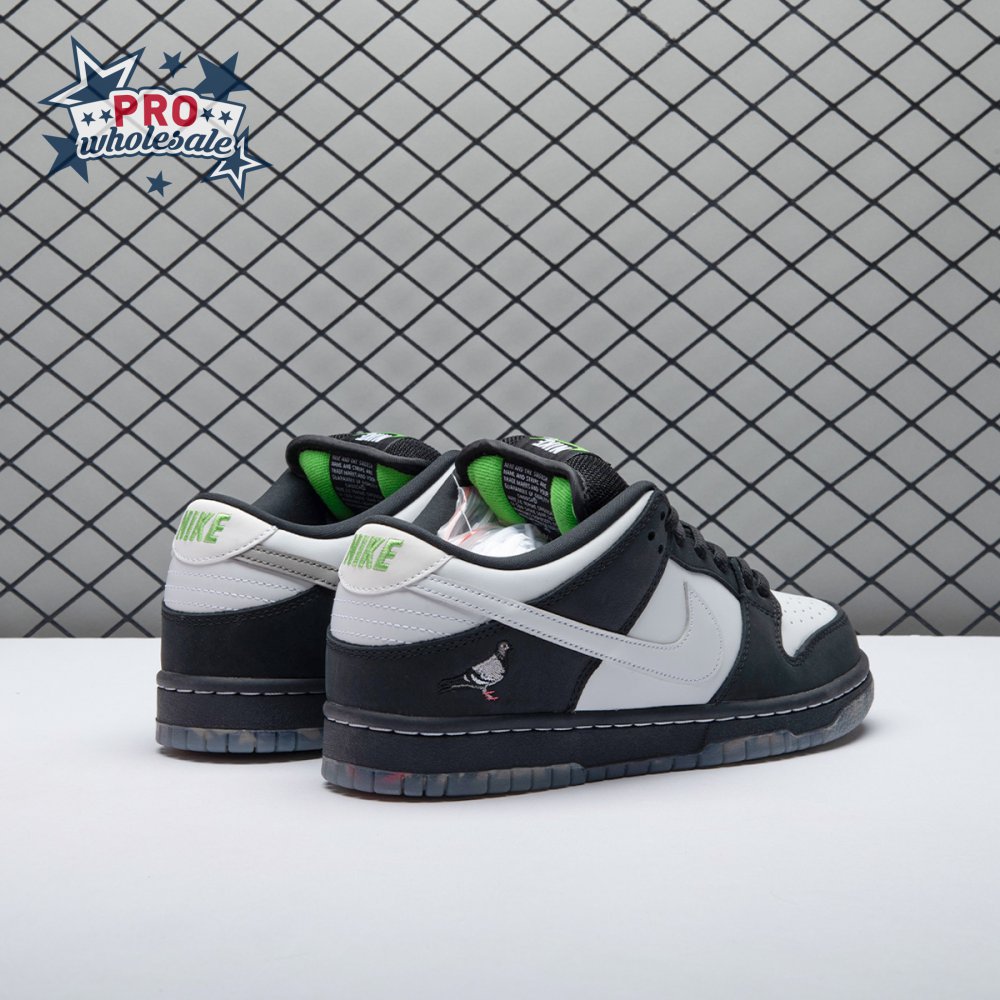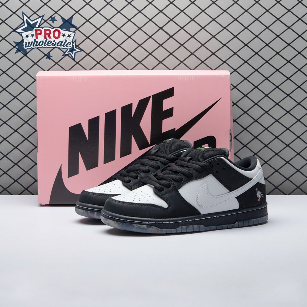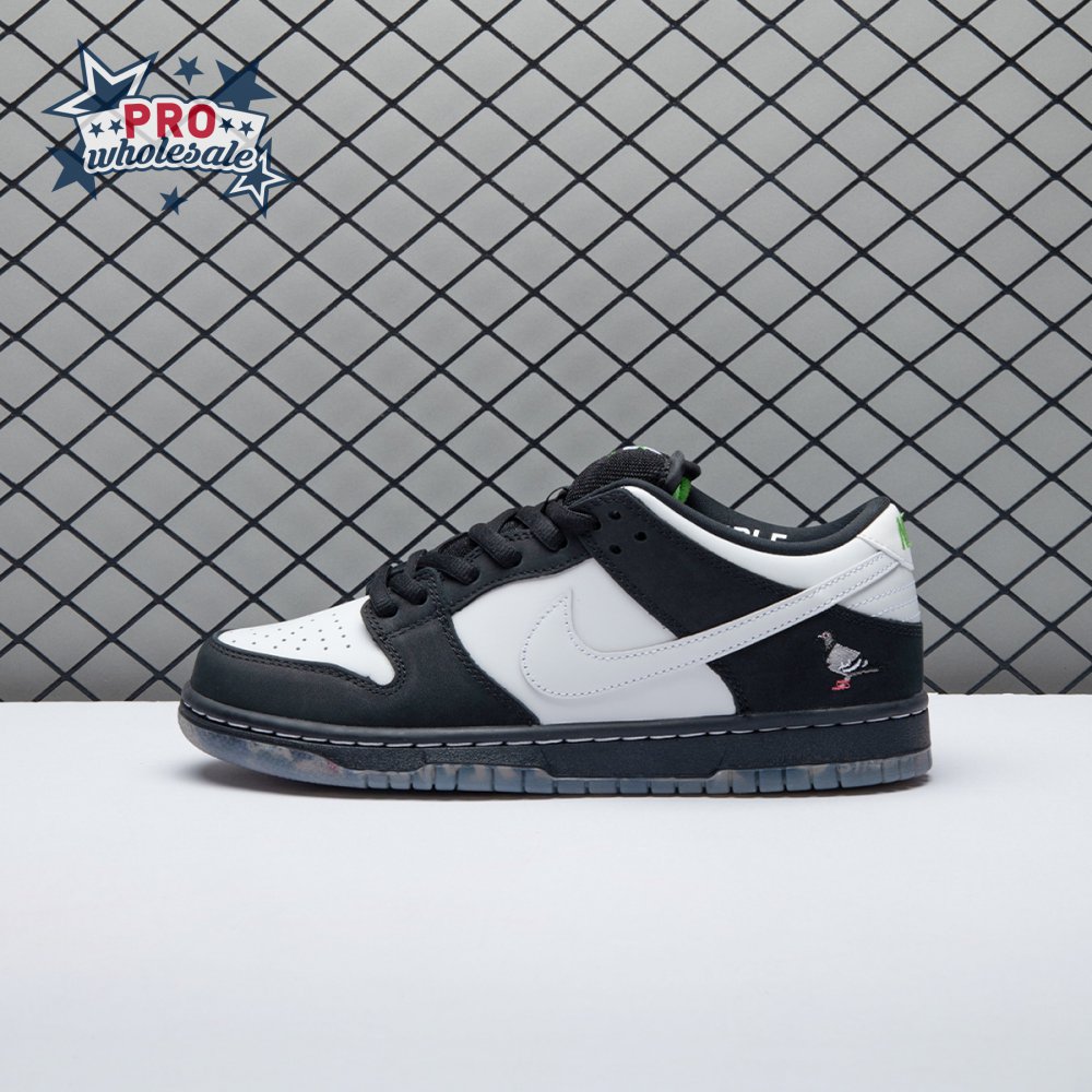 Originally conceived as a sample colorway that was initially rejected, the Jeff Staple x Dunk Low Pro SB "Panda Pigeon" continues Staple"s long-running partnership with Nike SB. The design lives up to its name with a black and white color scheme on the leather and suede upper, complete with the all-important pigeon on the lateral heel. A translucent outsole reveals a collage made up of newspaper headlines alluding to the infamous Pigeon Dunk launch from 2005.