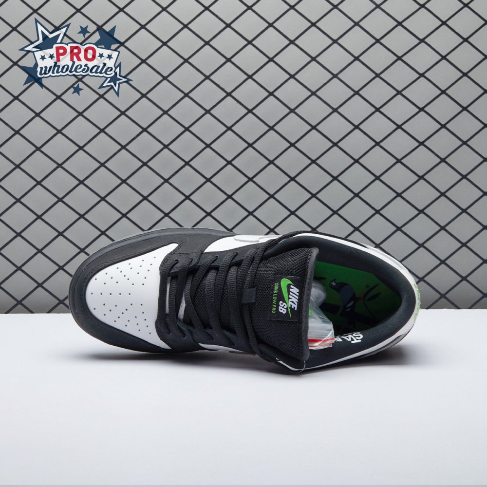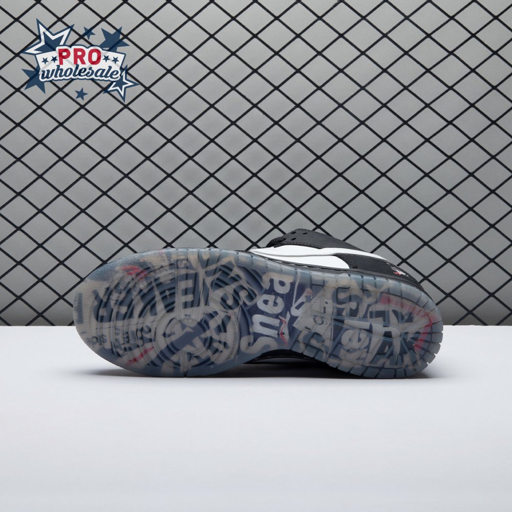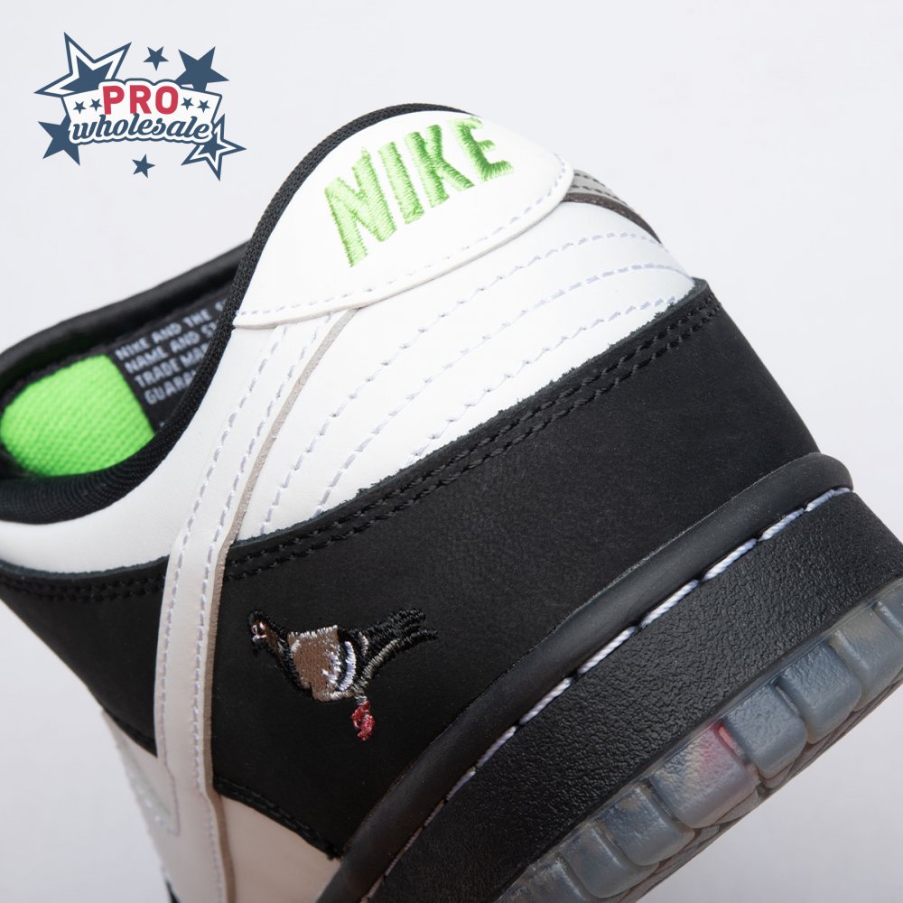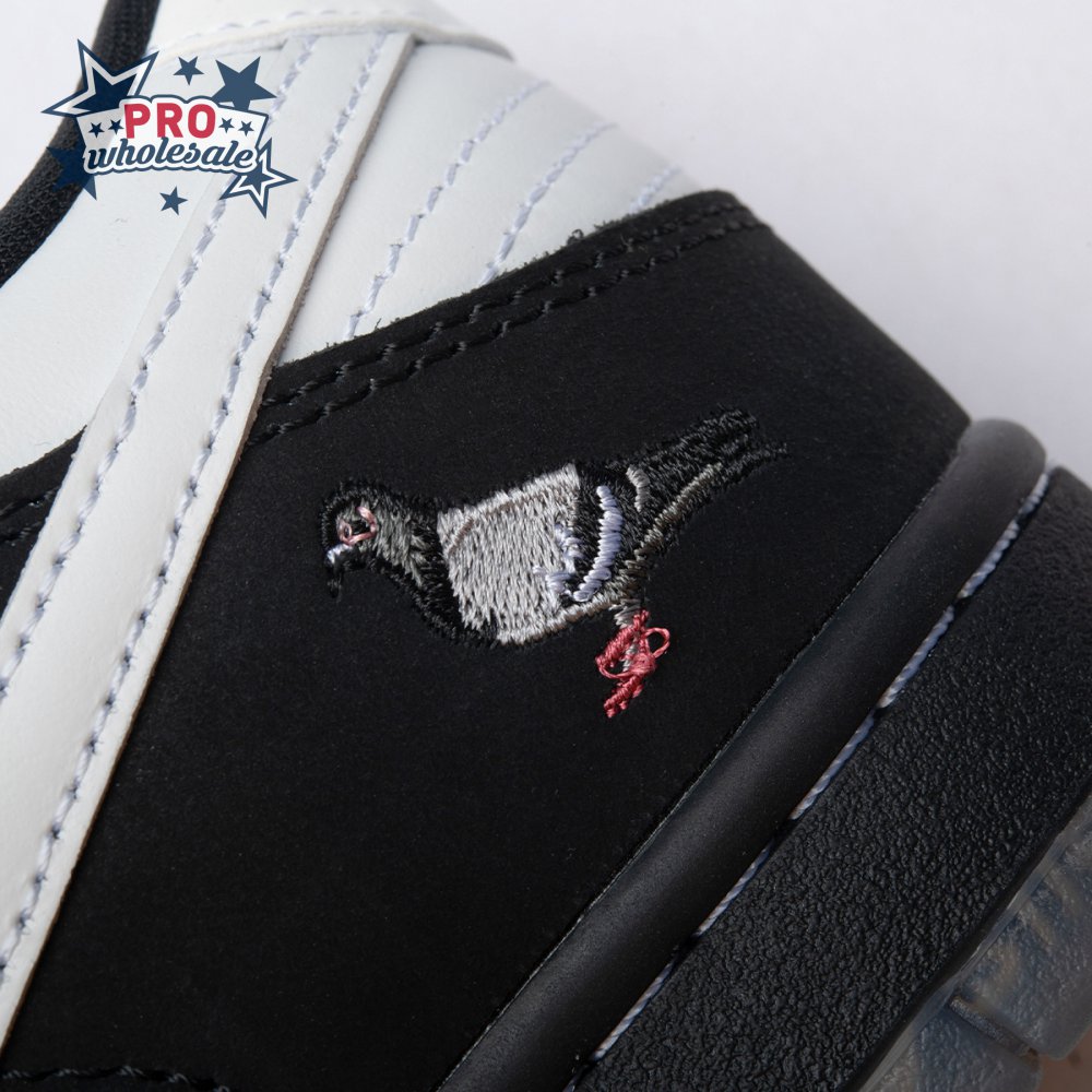 Originally conceived as a sample colorway that was initially rejected, the Jeff Staple x Dunk Low Pro SB "Panda Pigeon" continues Staple"s long-running partnership with Nike SB. The design lives up to its name with a black and white color scheme on the leather and suede upper, complete with the all-important pigeon on the lateral heel. A translucent outsole reveals a collage made up of newspaper headlines alluding to the infamous Pigeon Dunk launch from 2005.