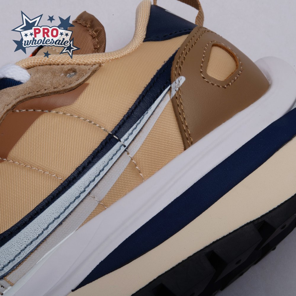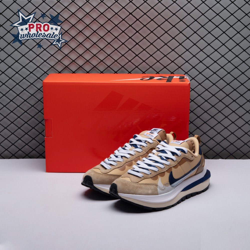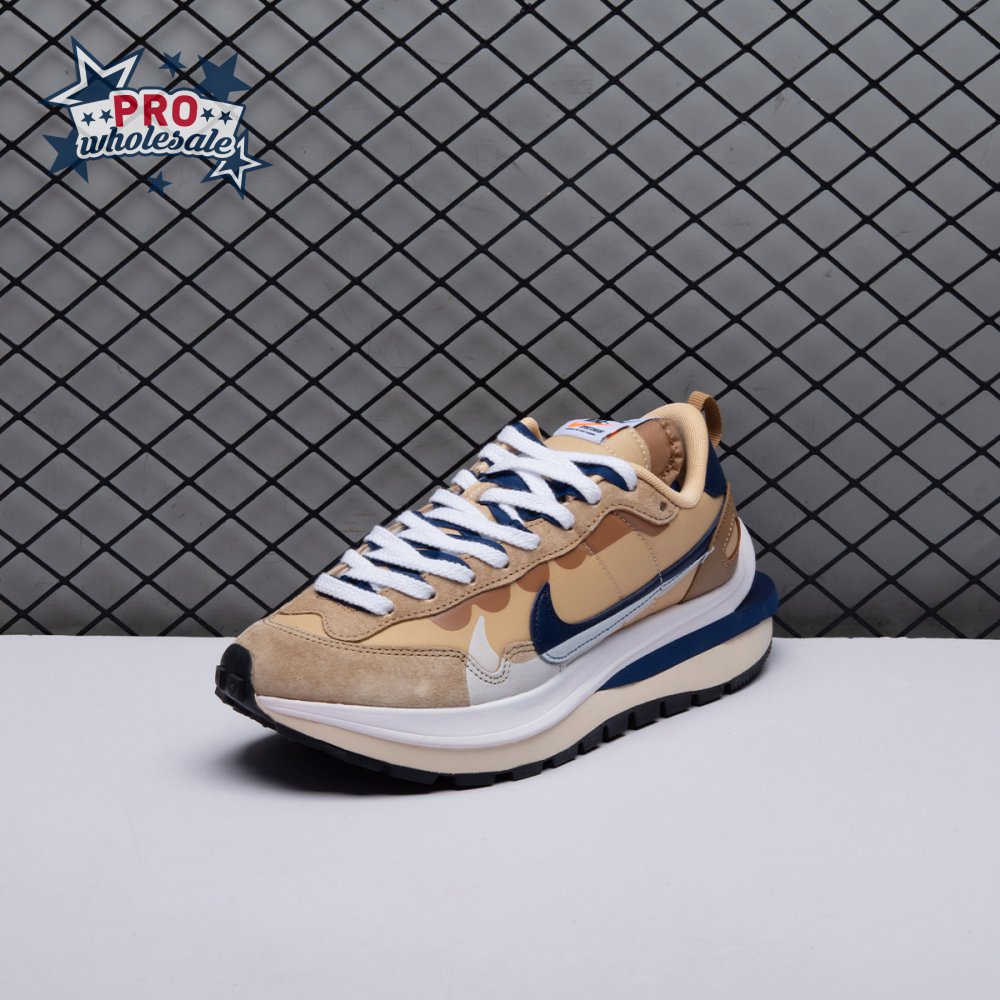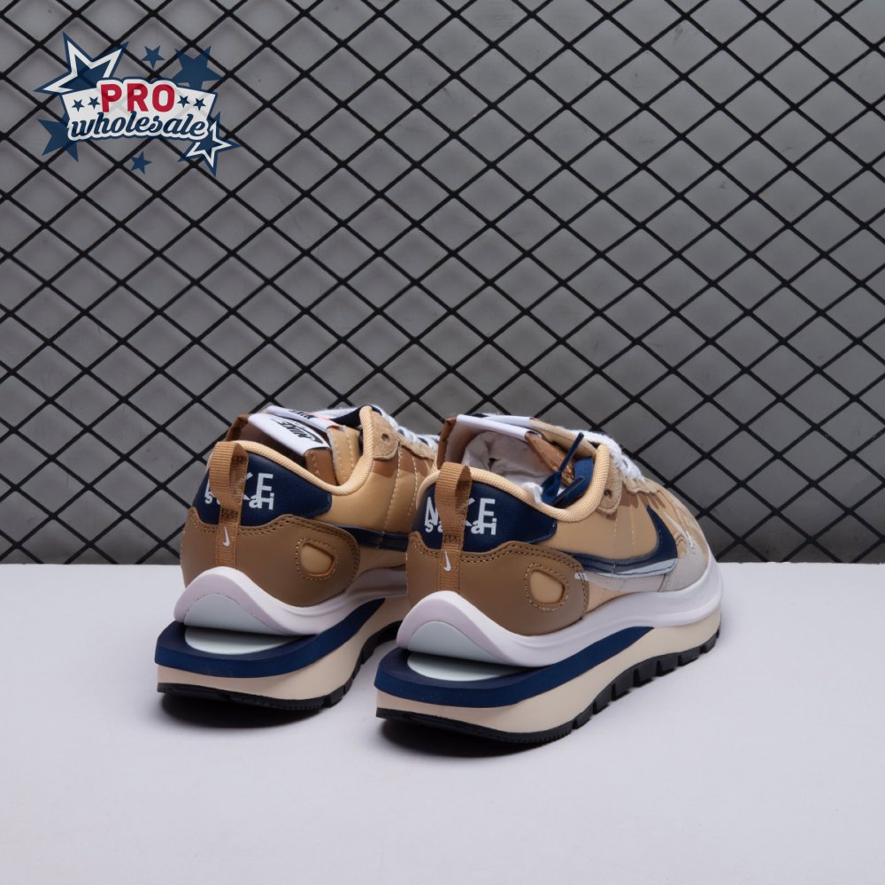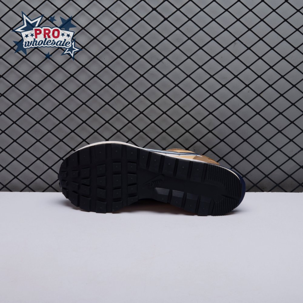 The sacai x Nike VaporWaffle "Sesame Blue Void" reunites the Swoosh with the Tokyo-based fashion label helmed by Chitose Abe. Blending elements from the modern Vaporfly and vintage Pegasus runner from 1983, the hybrid silhouette makes use of a khaki textile upper with tonal leather and suede overlays. A blue leather Swoosh is joined by a larger printed Swoosh in contrasting white. Tongues are similarly doubled up, each accented with a woven Nike tag. The sneaker rides on a dual-layered foam midsole, featuring split heel detailing and supported by a classic waffle tread outsole.