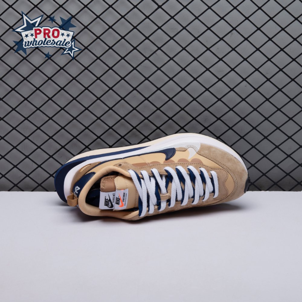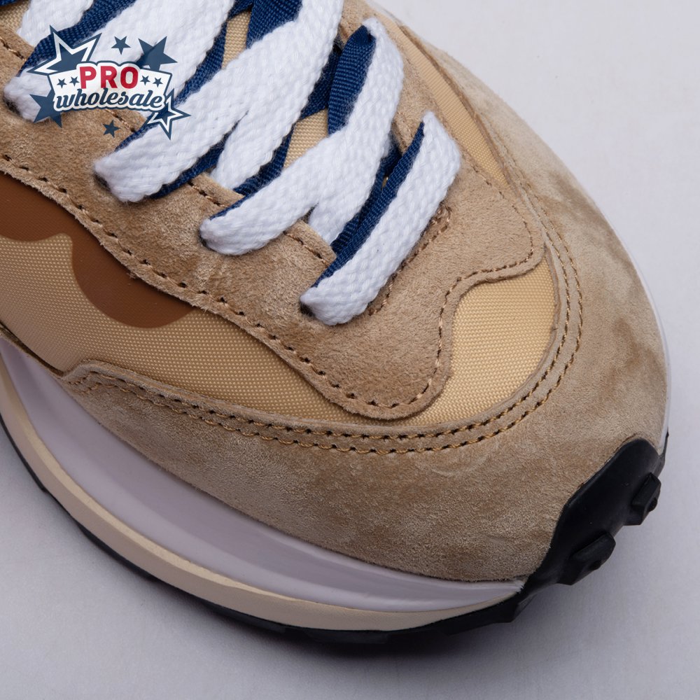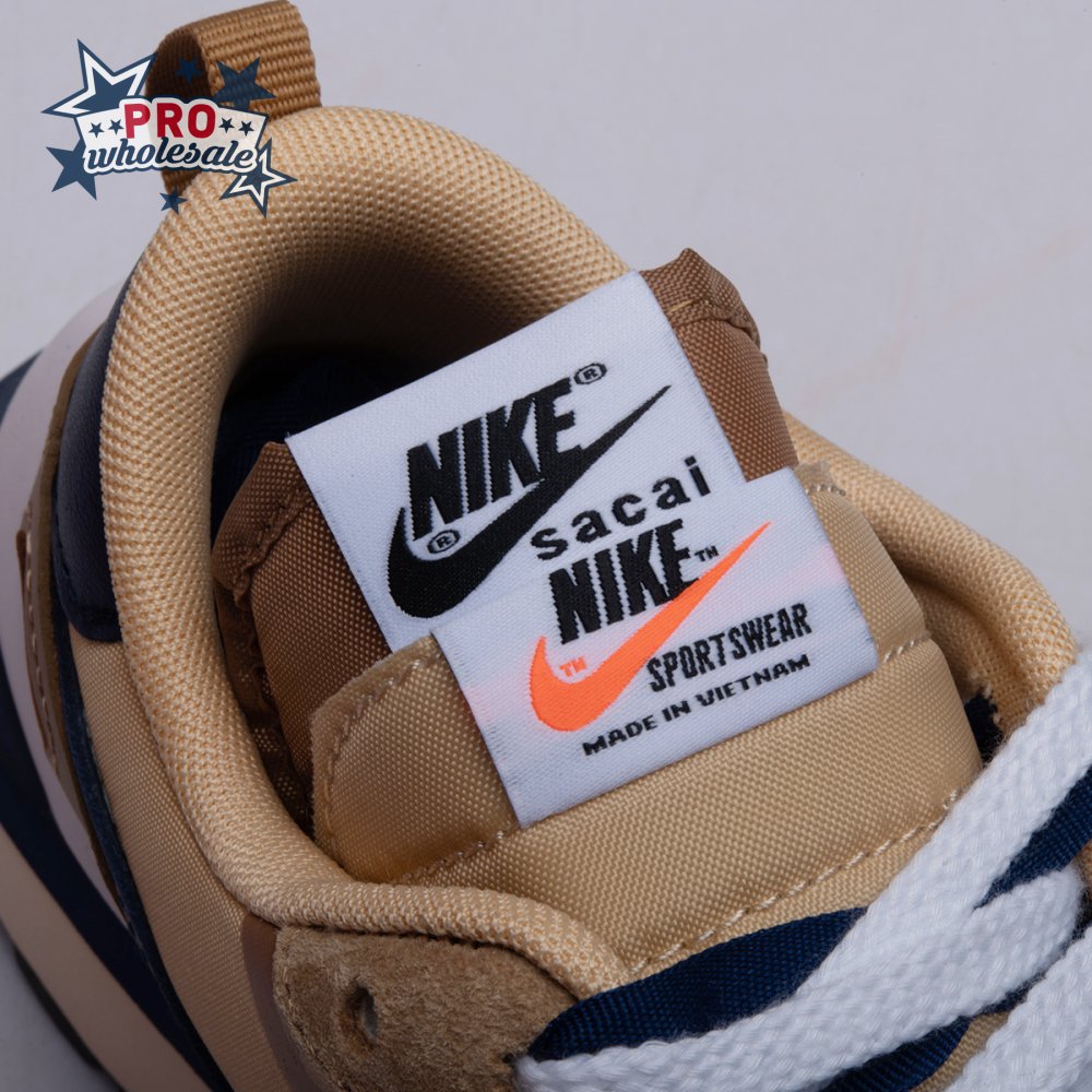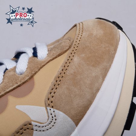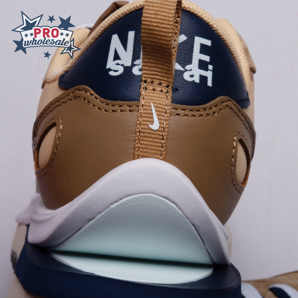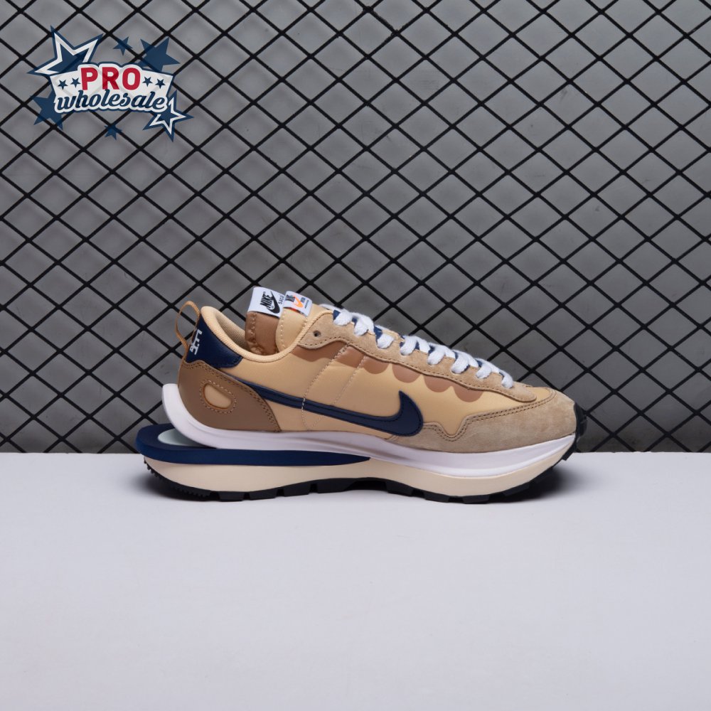 The sacai x Nike VaporWaffle "Sesame Blue Void" reunites the Swoosh with the Tokyo-based fashion label helmed by Chitose Abe. Blending elements from the modern Vaporfly and vintage Pegasus runner from 1983, the hybrid silhouette makes use of a khaki textile upper with tonal leather and suede overlays. A blue leather Swoosh is joined by a larger printed Swoosh in contrasting white. Tongues are similarly doubled up, each accented with a woven Nike tag. The sneaker rides on a dual-layered foam midsole, featuring split heel detailing and supported by a classic waffle tread outsole.